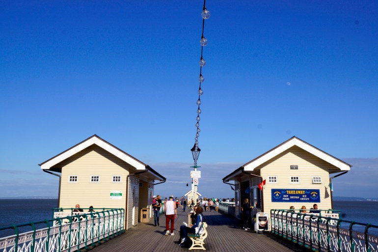 Nous avons marché le long de la jolie promenade pour aller sur la jetée. Quelle est belle! Elle m’a rappelée celle d’Arcachon, j’aime beaucoup les jetées parce que je les trouve très poétique. Celle-ci nous remonte dans le temps, elle date de l’époque Victorienne, la construction a commencé à 1894 et a été ouverte en 1895. Elle a été utilisé par l’armée lors de la Première Guerre Mondiale puis a été laissé à l’abandon jusqu’en 1929 quand Penarth Borough Council l’a racheté et lui a redonné un coup de peps avec un pavillon art déco. Il a servi de théâtre puis de cinéma mais cela n’a pas fait long feu, et de 1934 à 1939 a servi de salle de bal. Puis la Seconde Guerre Mondiale… il a fermé. Et re-ouvert en 1950, que d’histoire! De nos jours la pavillon inclue une galerie, un auditorium, un cinéma de 70 places, quelques magasins, restaurants et cafés, et tout cela avec vue sur le Canal de Bristol.