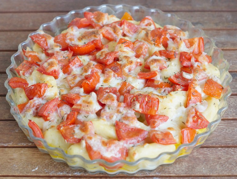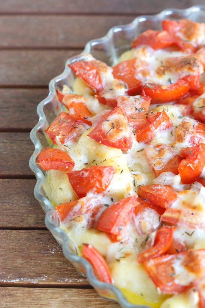 Pour deux personnes. 400g de gnocchis (si vous prenez ma recette de gnocchis, divisez-la en deux), 7 tomates de taille moyenne, 1 mozzarella, du thym, de l’huile d’olive, du sel et du poivre.