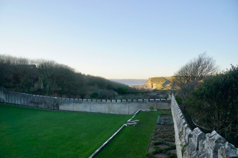 On se l’imagine difficilement mais ce château était grandiose en son temps. Les toutes premières pierres ont été posées au milieu du 12ème siècle par Arnold le Boteler, il n’est donc pas tout jeune et a depuis été possédé par plusieurs propriétaires; la famille Vaughan, la famille Wyndham, puis par mariage le second Compte de Dunraven, le troisième et ses descendants. Il a été remodelé au fil du temps, pour correspondre aux goûts de ses occupants, aux époques, il a aussi servi d’hôpital militaire pendant la Seconde Guerre et en 1963, c’est le drame: la maison est démolie. Les ruines font désormais parties du Glamorgan Heritage Coast et sont protégées. Lorsque vous entrez dans les ruines, vous trouvez un jardin très fourni en été, un peu triste en hiver (comme c’est le cas sur les photos) mais tout de même bien entretenu (admirez le vert de cette pelouse tout de même… on se croirait au Pays Basque – ahah).