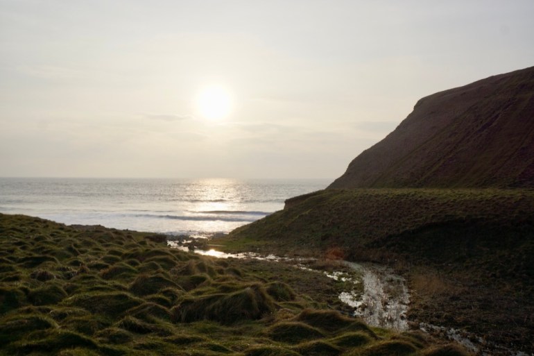 Si nous nous trouvons quelque part où se trouve une falaise, on ne peut s’empêcher de la monter afin de prendre de la hauteur. De là-haut, l’air déjà si pur (Nash Point est relativement désert), est encore plus glaçant qu’en bas, il nous a même été dur d’enlever les gants pour prendre les photos! Mais la vue est à couper le souffle (la photo d’en tête est prise d’en haut aussi). Vous pouvez voir sur la seconde photo le sens du vent et son effet sur les herbes. Il dessine de belles vaguelettes.