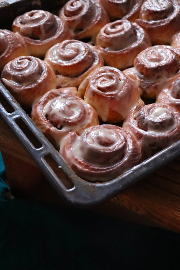 La cuisson. Préchauffer le four à 200°C, enfourner et laisser cuire jusqu’à ce que les roulés soient bien dorés (environ 20/25mn selon votre four). A la sortie du four, mélanger les ingrédients pour le glaçage et l’étaler avec une spatule ou un pinceau sur les roulés. Servir chaud si possible.