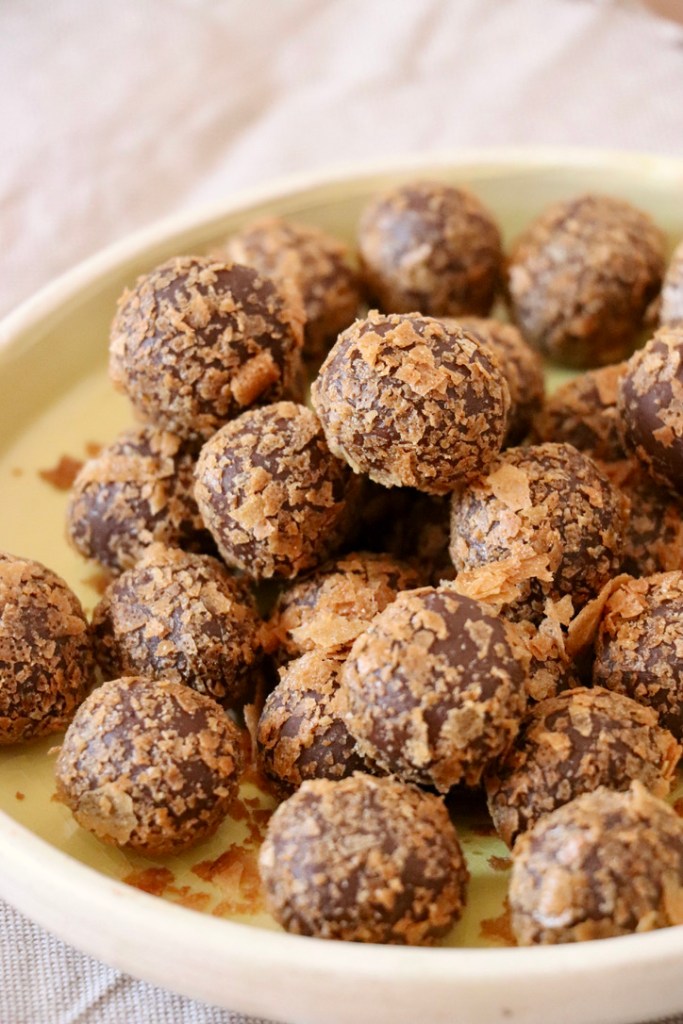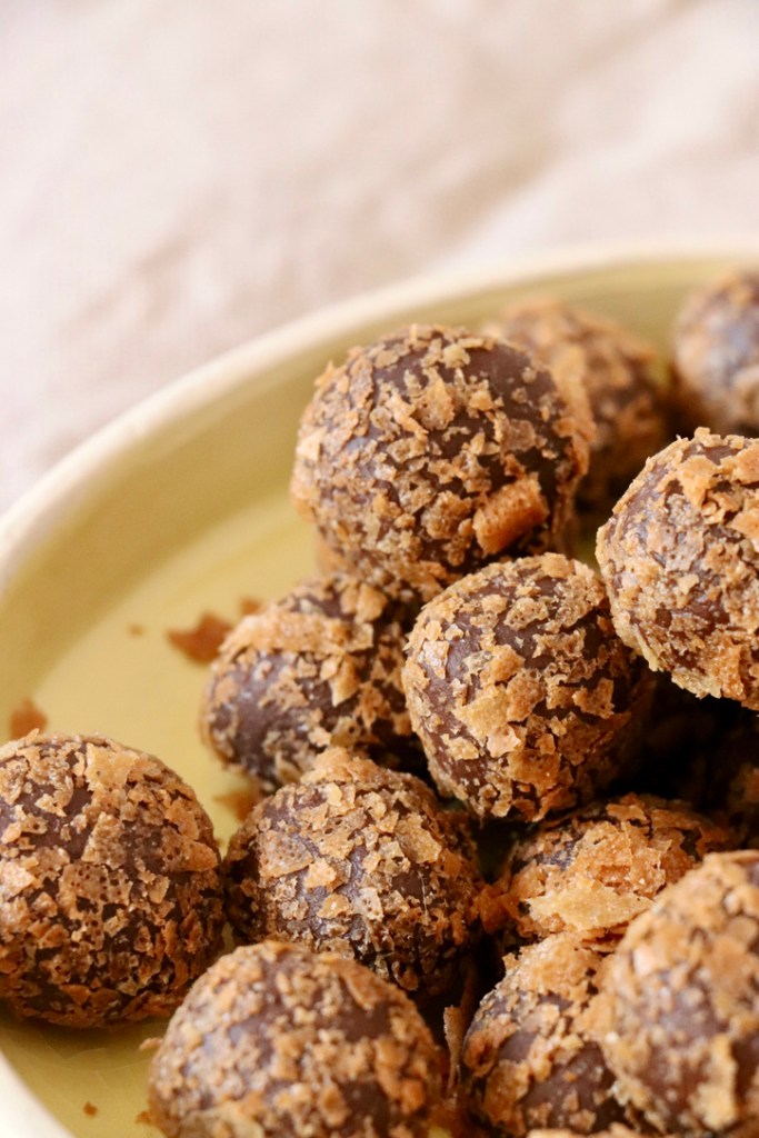 Vous avez un peu chauffé le chocolat en le travaillant, je vous conseille de mettre les boulettes au moins 15mn au réfrigérateur avant de les manger. Laissez-les au frais jusqu’à dégustation. Si dégustation il y a, c’est à dire si vous ne piquez pas une boulette à chaque passage devant le réfrigérateur. Le Barbu a dit que c’était dangereux comme recette, je ne fais que vous prévenir, vous êtes maîtres de vos petites mains.